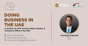 We are delighted to announce that Francesco Bulleri, Partner at ADG Legal, will be speaking at the upcoming roundtable “Doing Business in the United Arab Emirates”, organized by the Italian Chamber of Commerce in the UAE (IICUAE) in collaboration with International Free Zone Authority | IFZA.